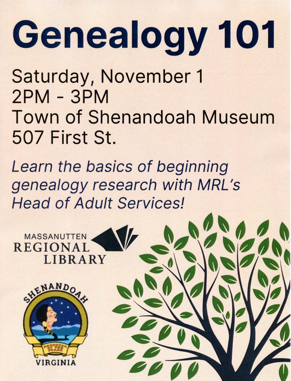 Join us at the Town of Shenandoah Museum to learn the basics of beginning genealogy research, with Massanutten Regional Library's Head of Adult Services Kristin Noell Evans! We'll cover resources available at MRL and where you can go when your research has expanded beyond our collections.