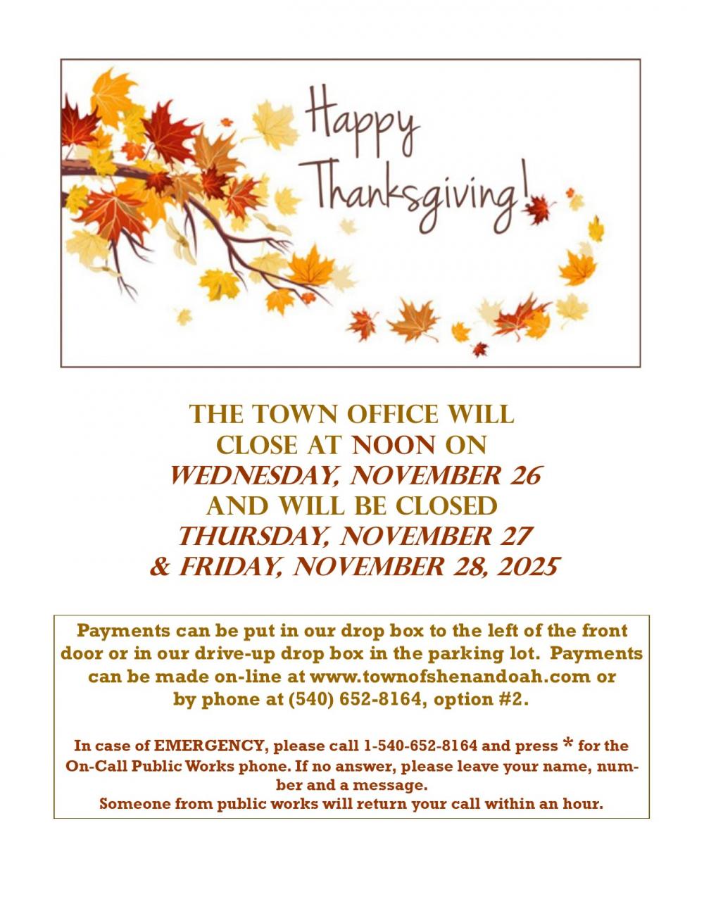 Town Hall and the Town of Shenandoah Museum and Welcome Center will be Closing at Noon today in observance of Thanksgiving.